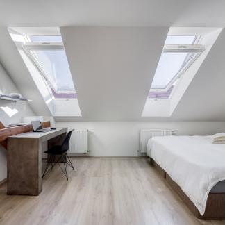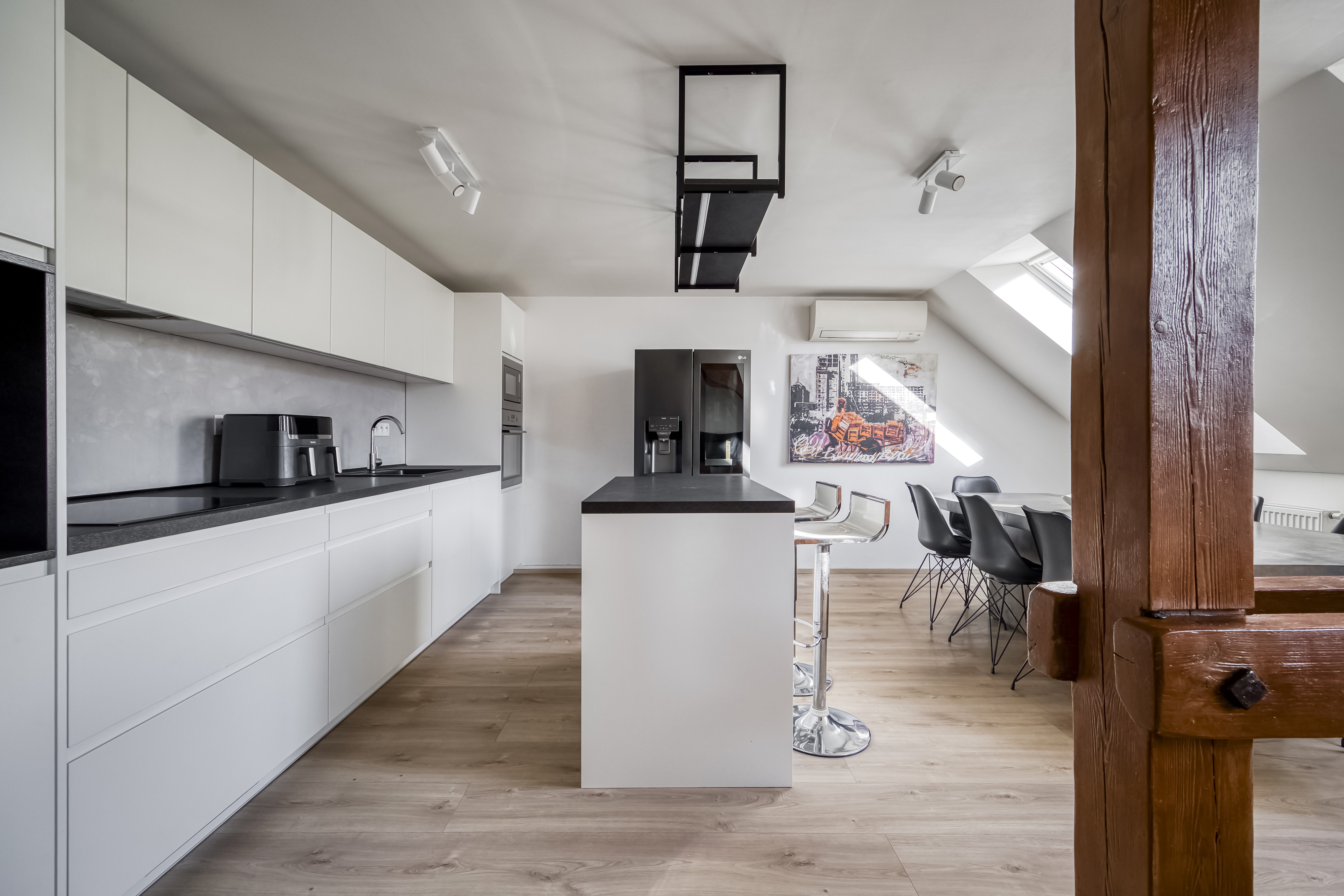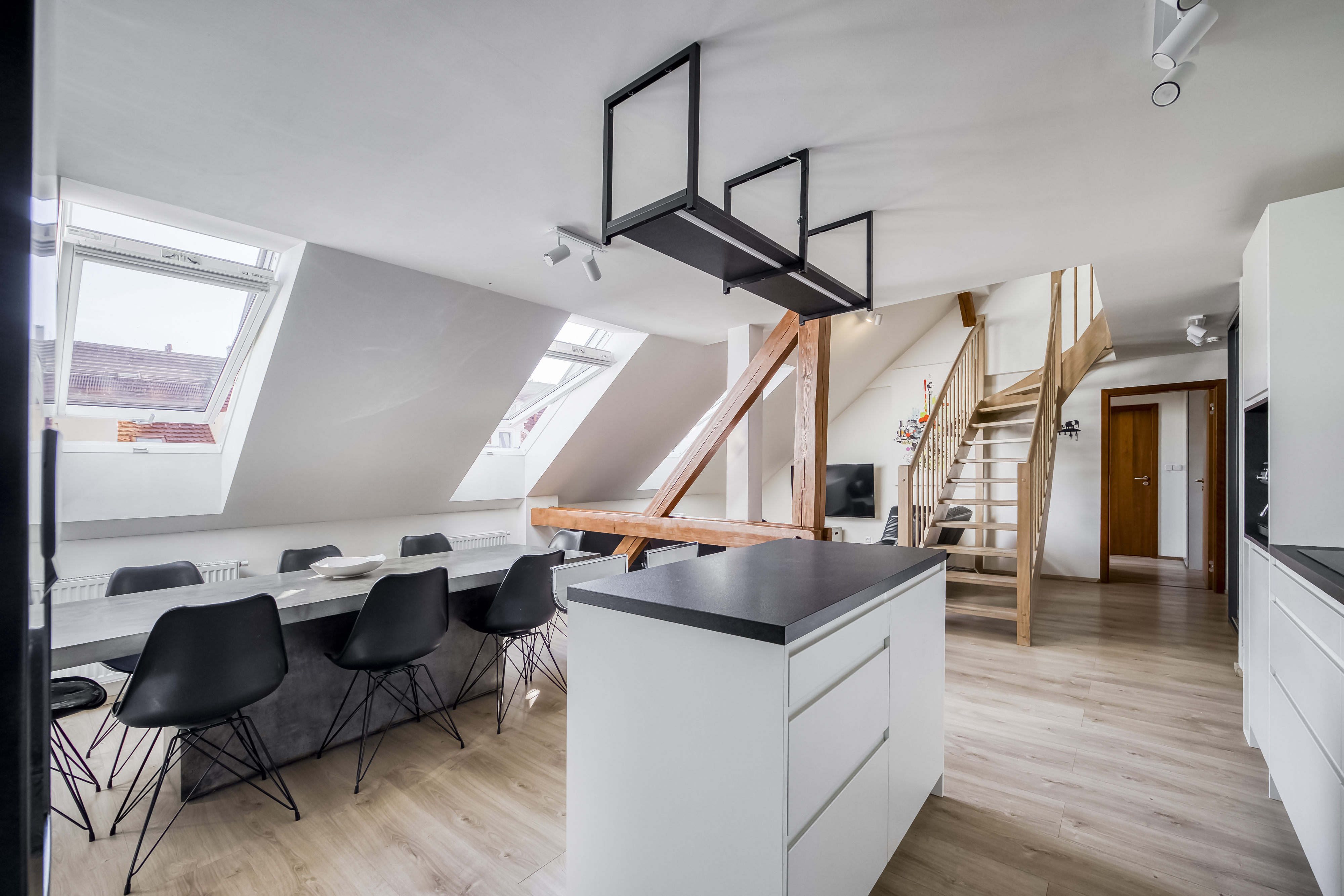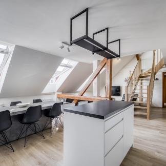 Byt je situován v posledních dvou patrech činžovního domu z období secese a nabízí příjemnou atmosféru podkrovního bydlení s přiznanými trámy. Lokalita patří mezi velmi vyhledávané díky své centrální poloze a blízkosti nábřeží řeky Vltava a oblíbené pražské náplavky, která je známá kavárnami, restauracemi a kulturním životem.