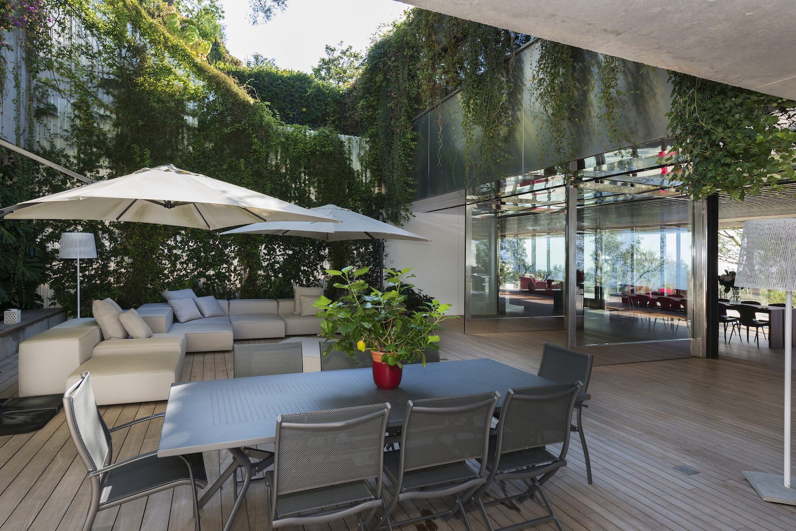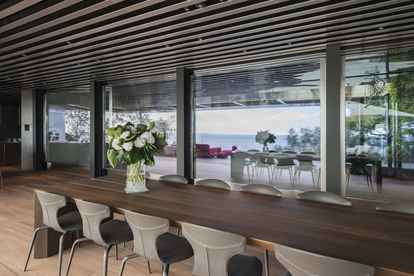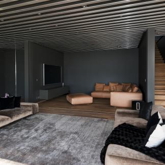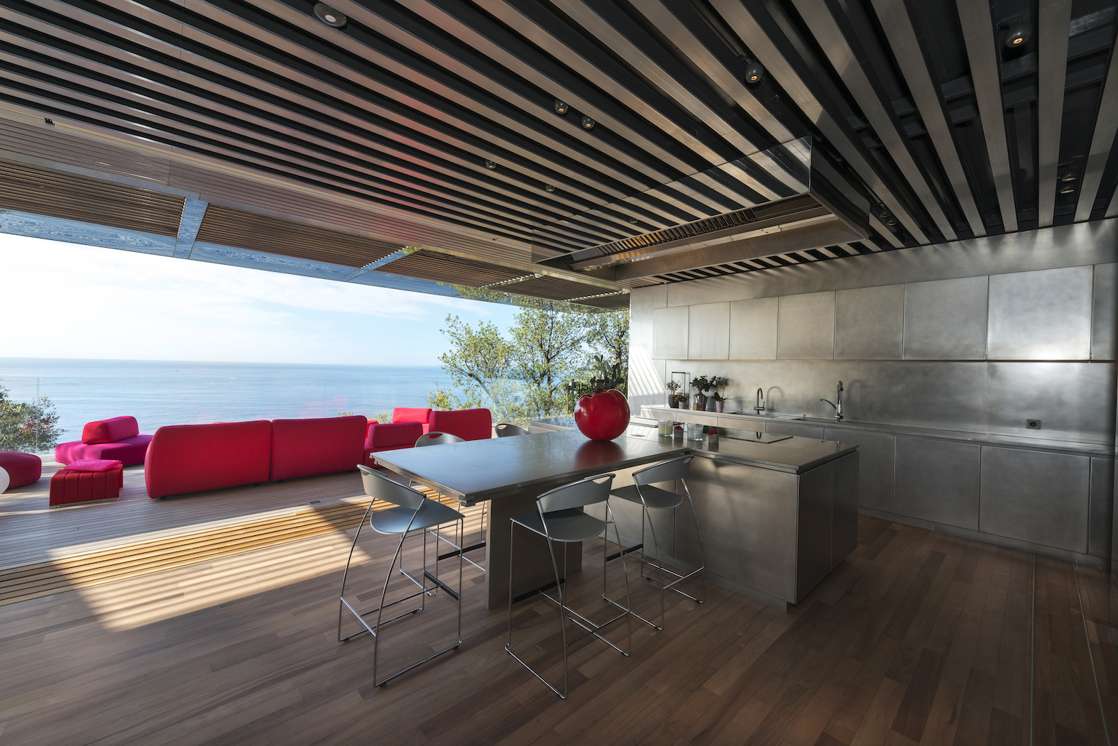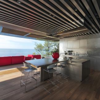 Vstup je přes střechu, která je zcela osázena rostlinami. Lanovka lemovaná schodištěm spojuje dvě obytná patra: čtyři apartmá a obývací pokoj, který je díky svému objemu a výhledu na rozlehlou azurovou hladinu přímo úchvatný.
