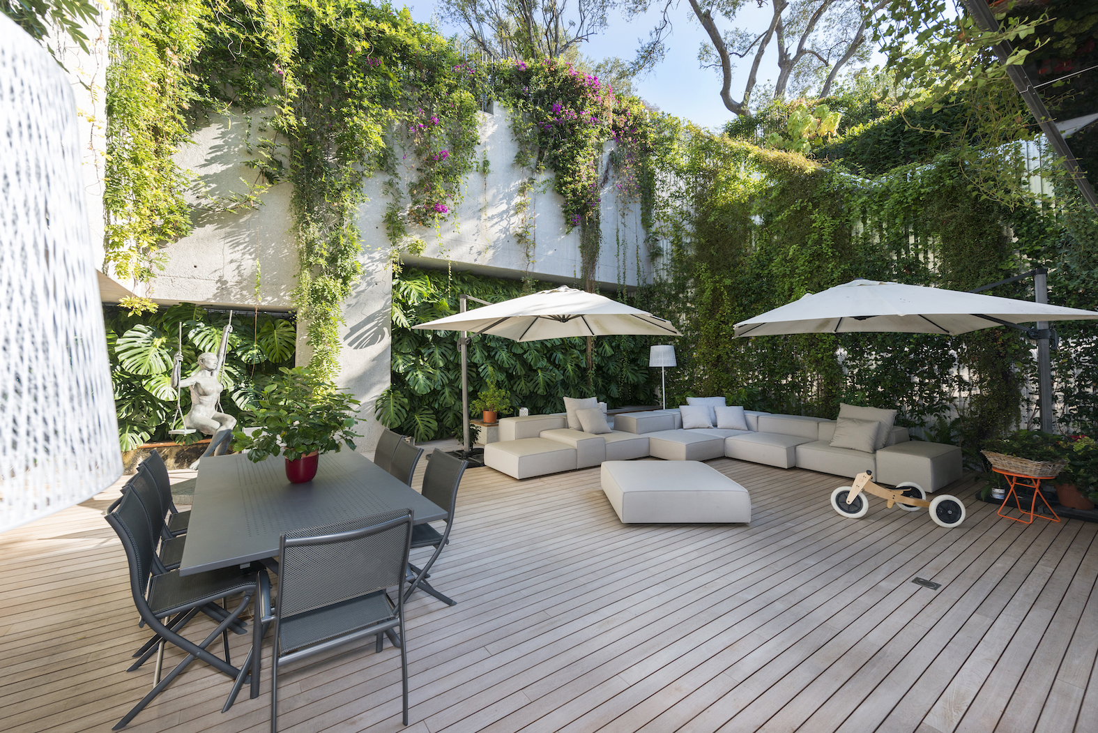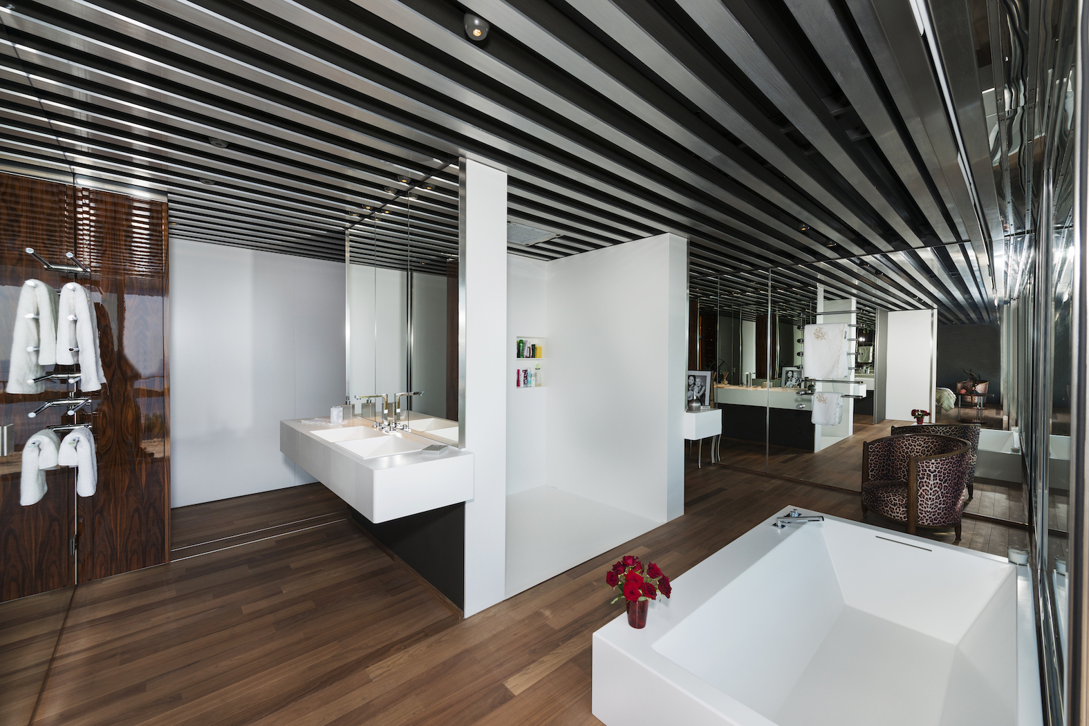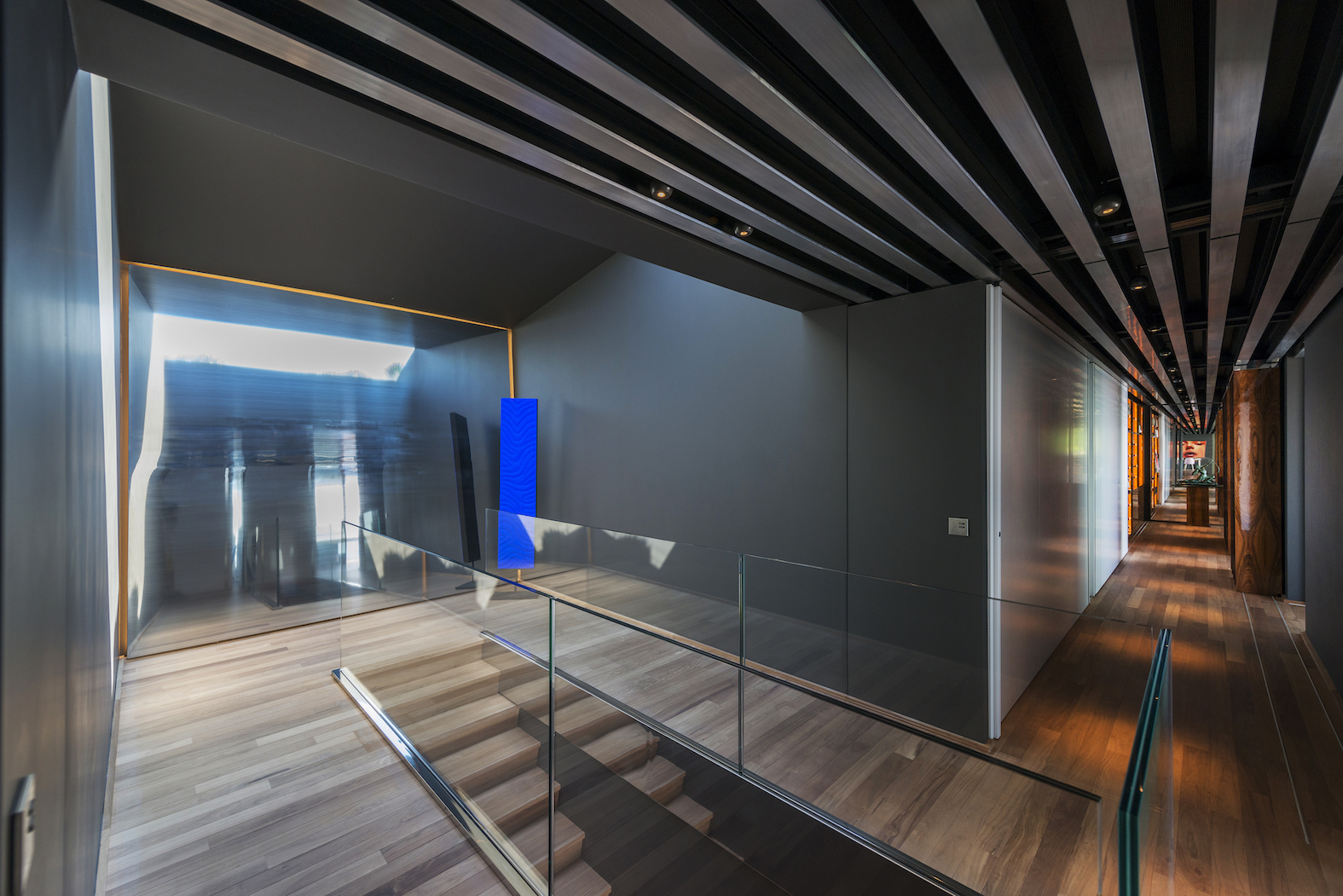 Vstup je přes střechu, která je zcela osázena rostlinami. Lanovka lemovaná schodištěm spojuje dvě obytná patra: čtyři apartmá a obývací pokoj, který je díky svému objemu a výhledu na rozlehlou azurovou hladinu přímo úchvatný.