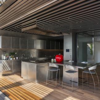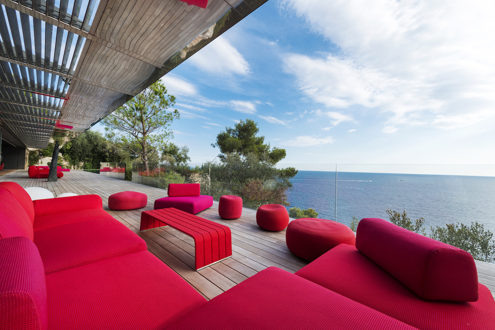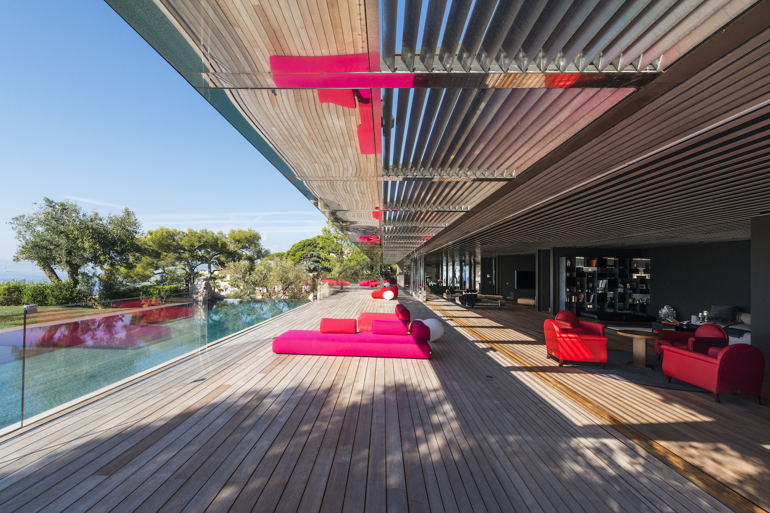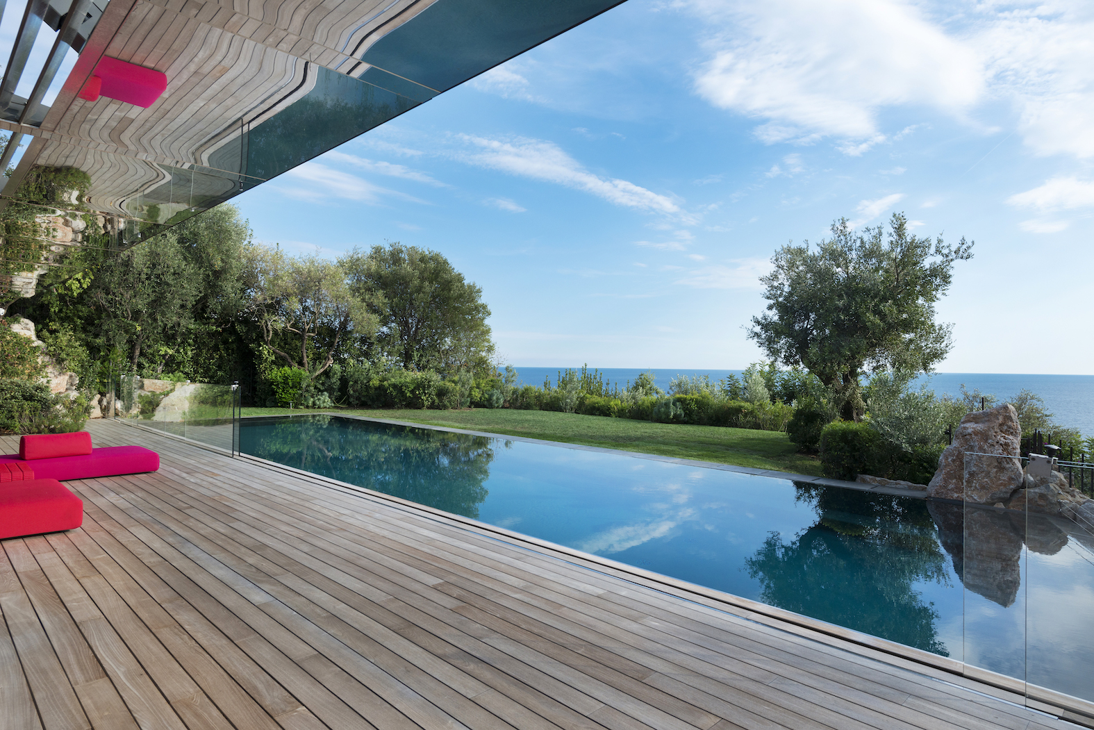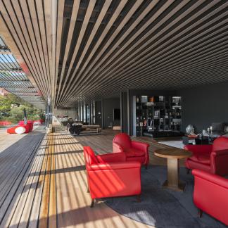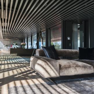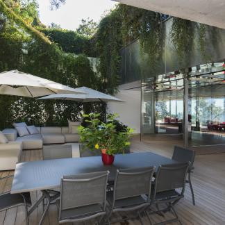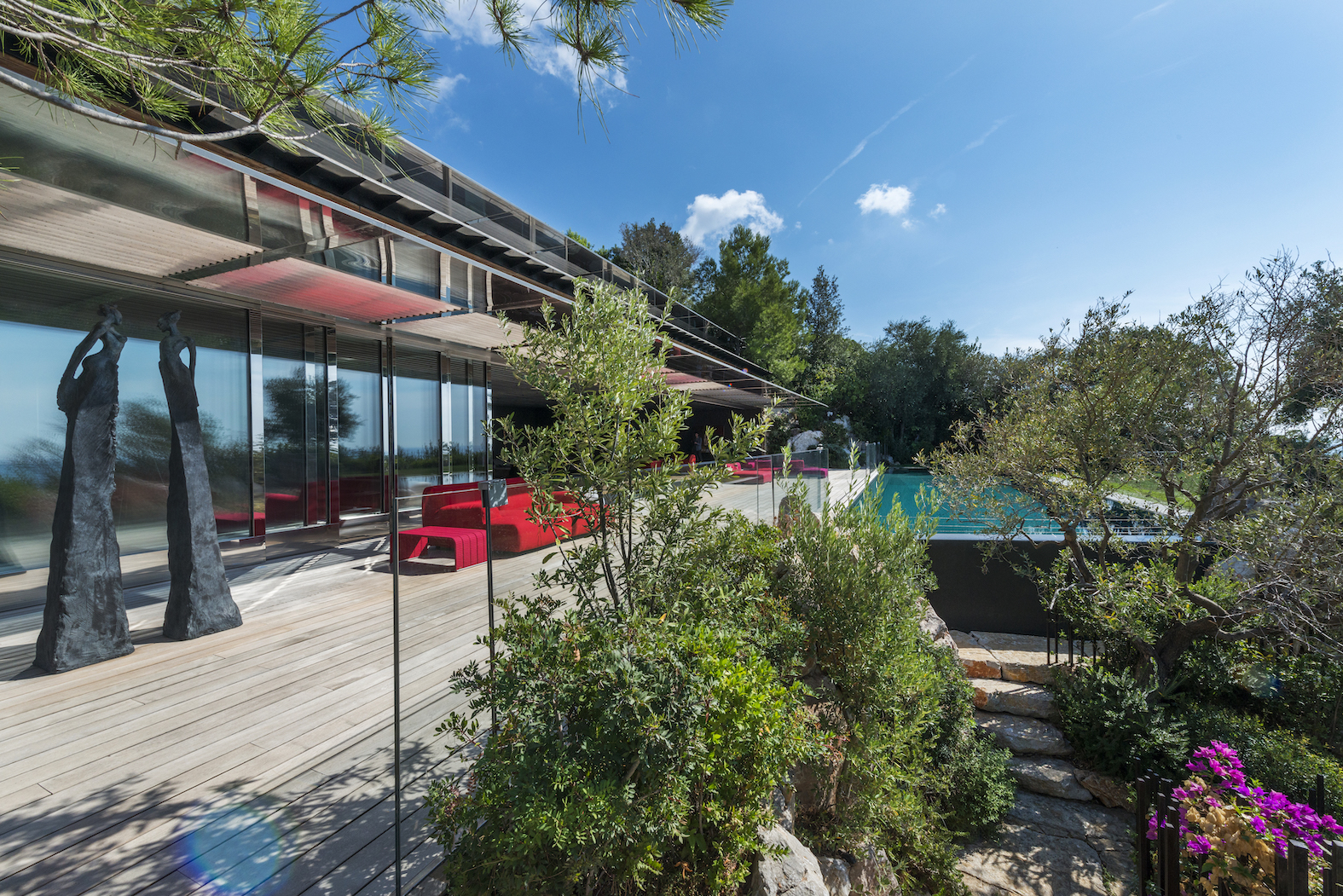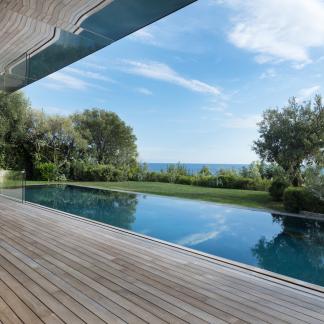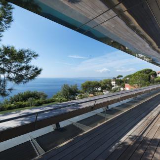 Od vchodu je krása diskrétní. Od moře se konstrukce z nerezové oceli a skla skládá z geometrických a horizontálních linií na výběžku z viditelných kamenů osázených středomořskými rostlinami.