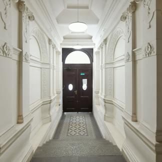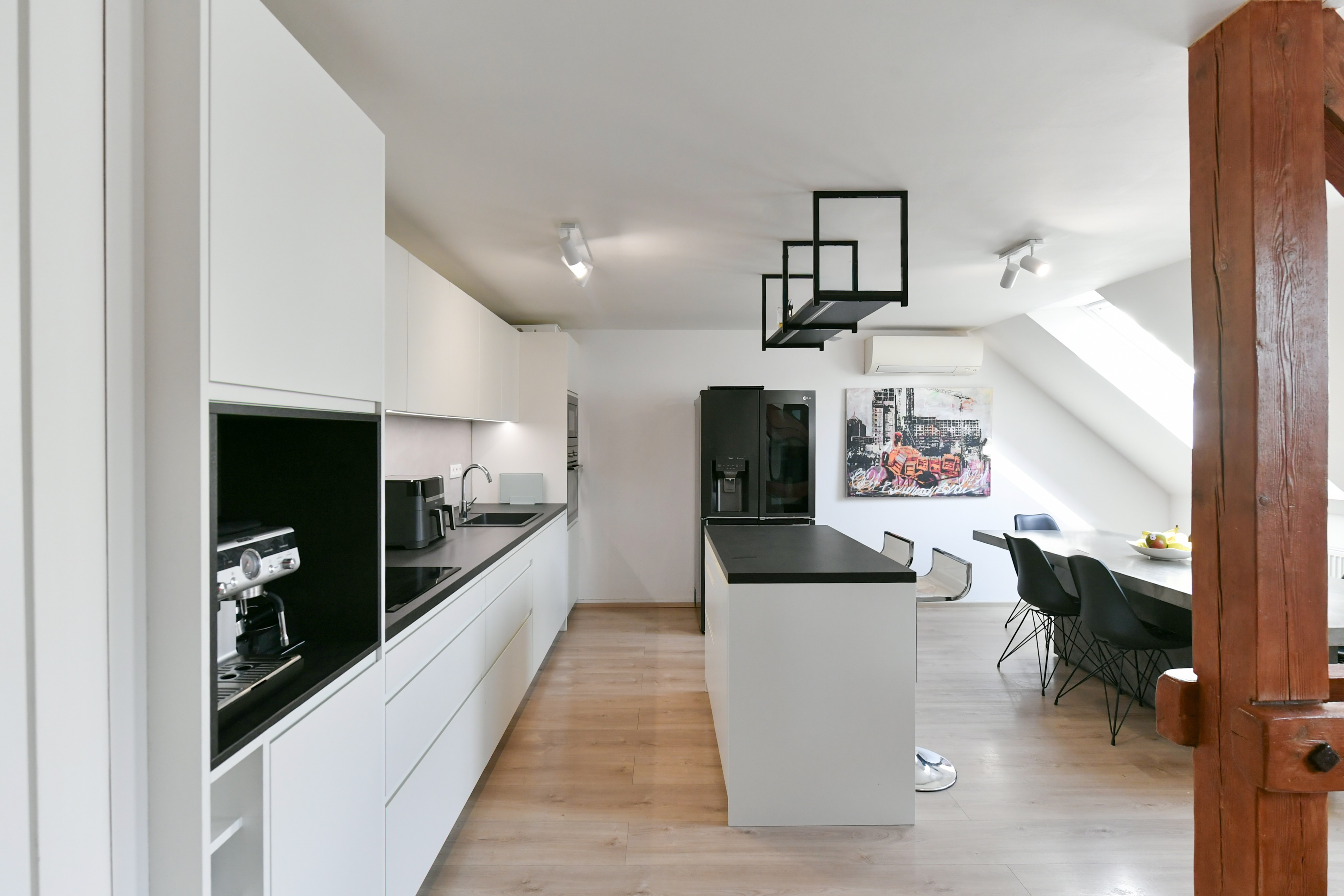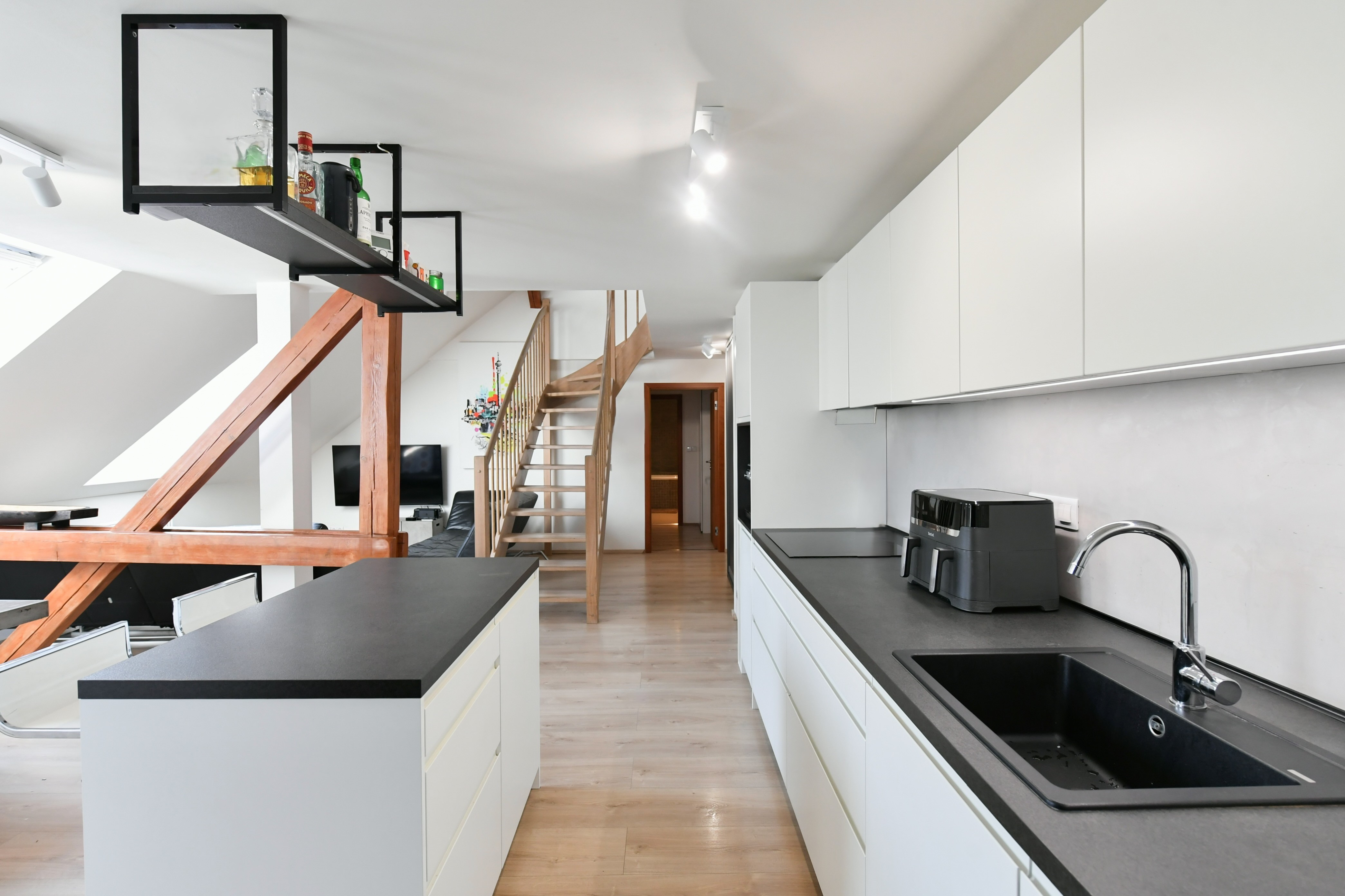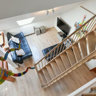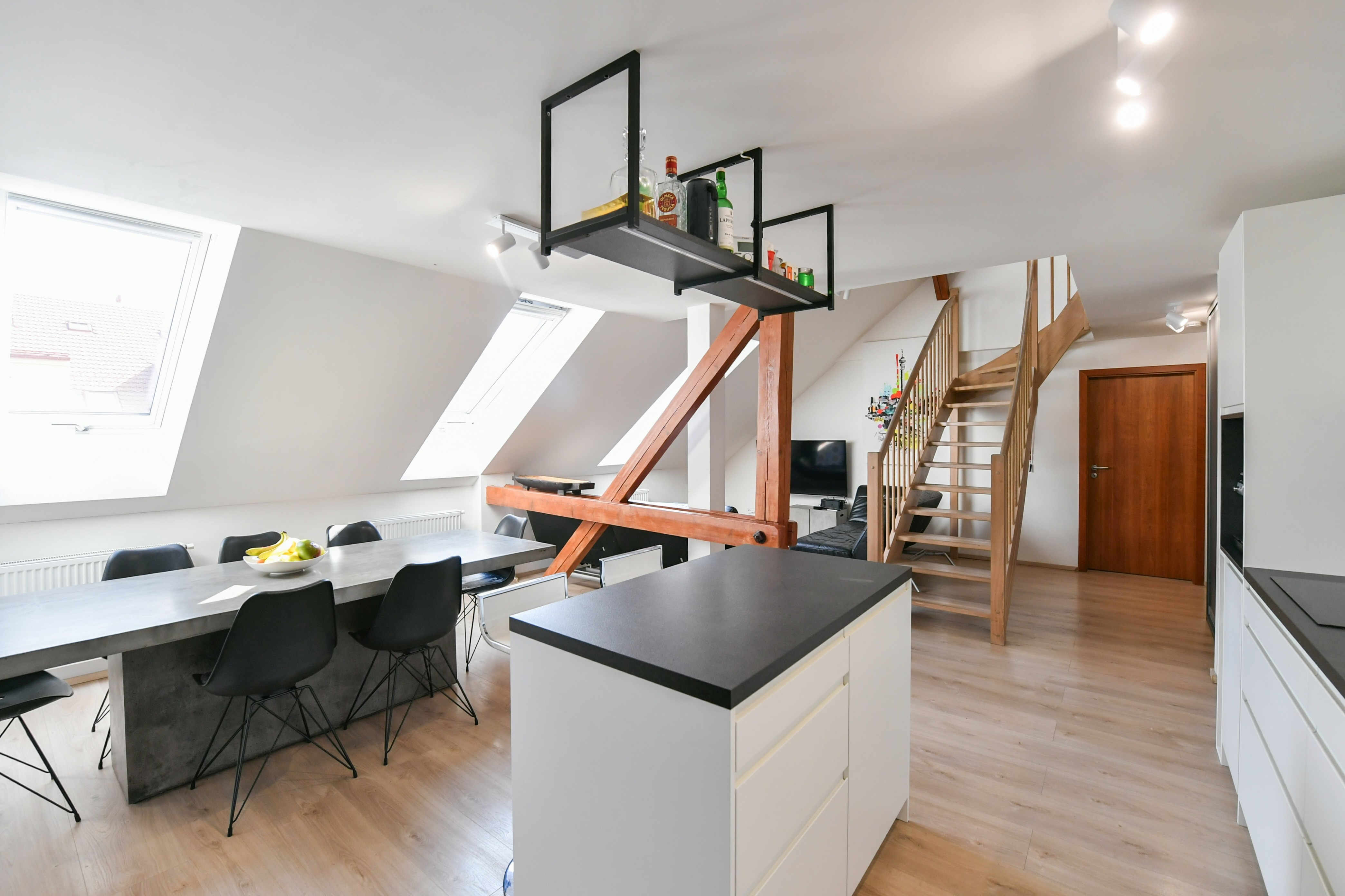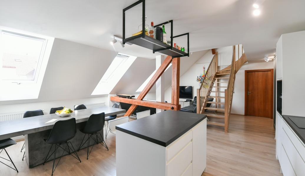 The apartment is situated on the last two floors of a tenement house from the Art Nouveau period and offers a pleasant atmosphere of attic living with exposed beams. The location belongs among very sought-after ones thanks to its central position and the proximity of the embankment of the Vltava river and the popular Prague riverside promenade, which is known for cafés, restaurants and cultural life.