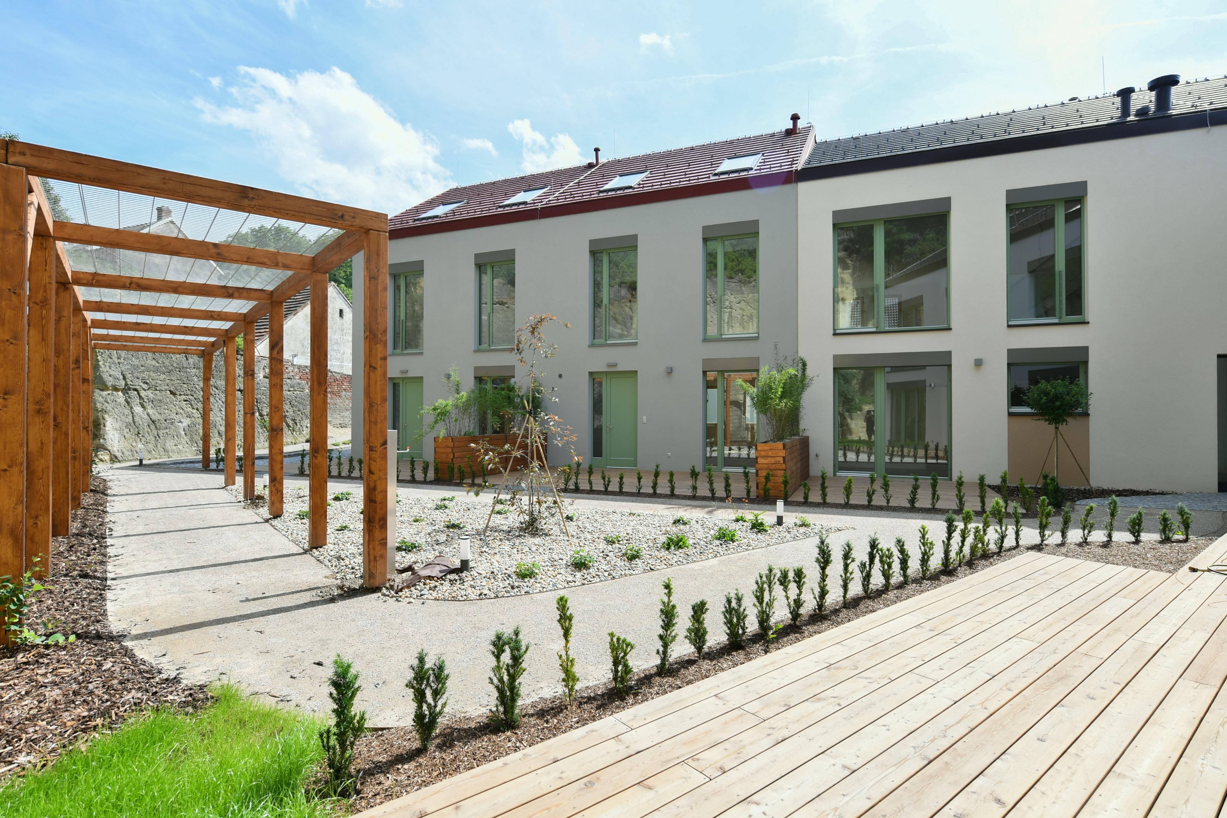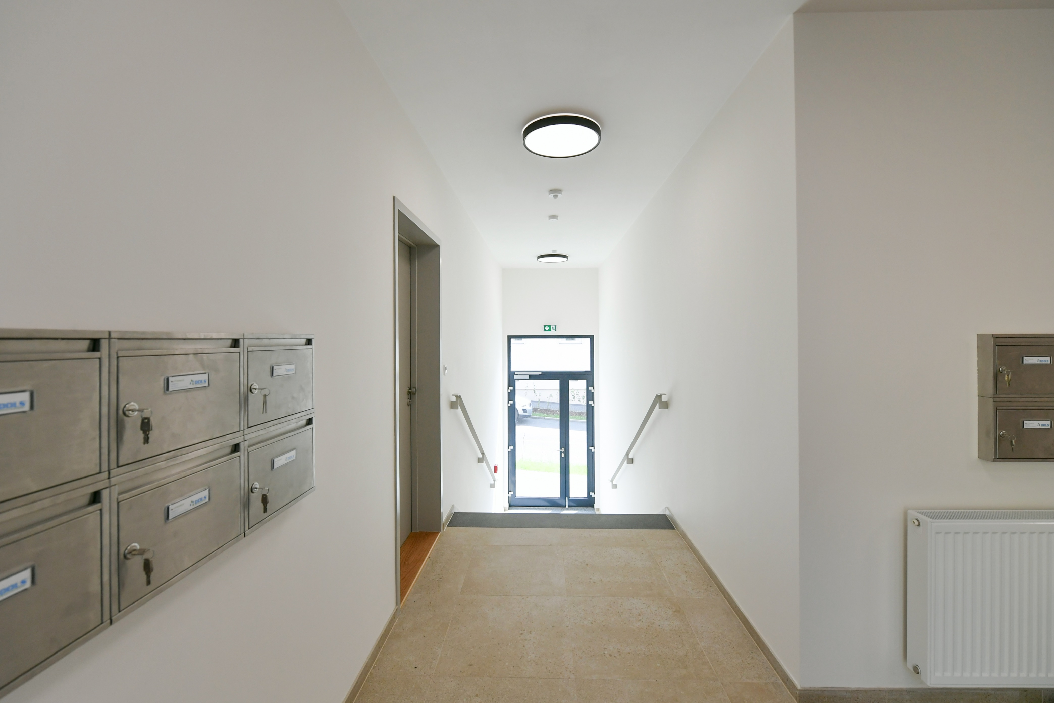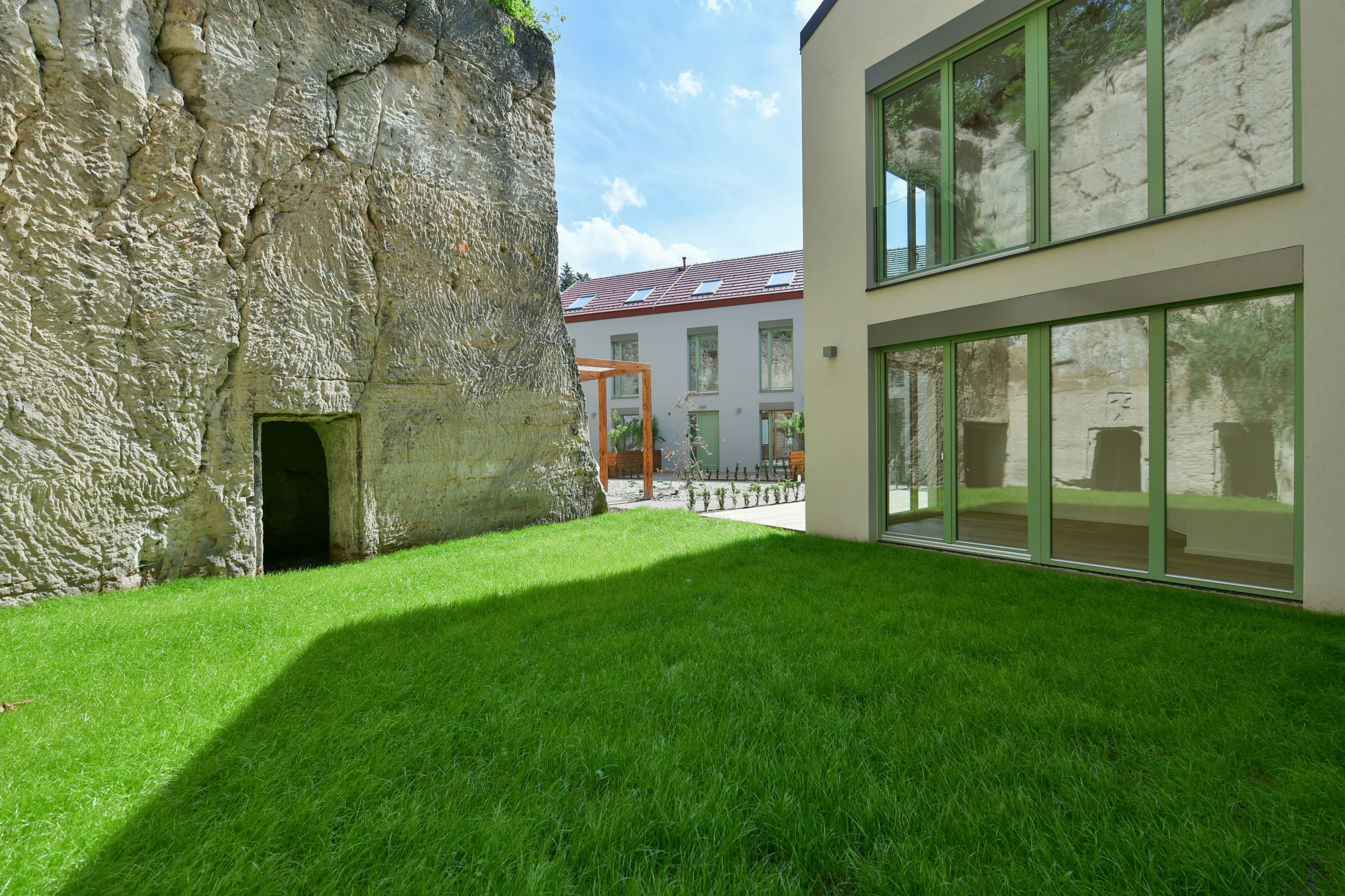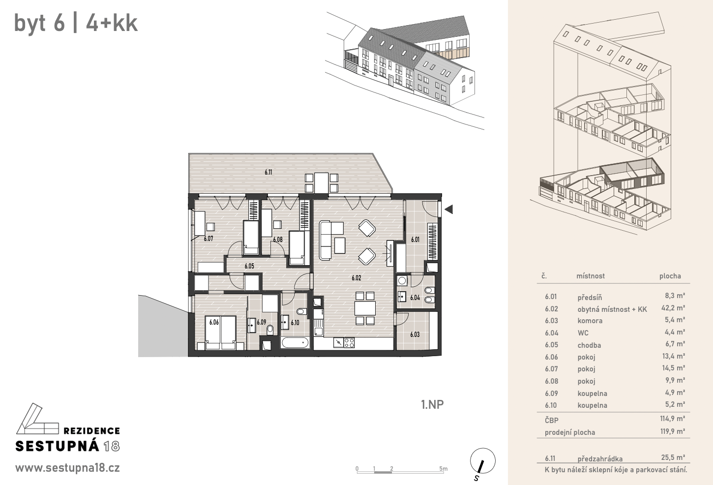 Apartment No. 6 is a very quiet and sunny ground-floor apartment with many French windows and direct access from most rooms to a spacious front garden of approx. 25,5m2. The apartment is entered either from the garage via the elevator to the entrance hall or through the main entrance to the house from Sestupná street, and the owner can receive the guests directly from the garden.
