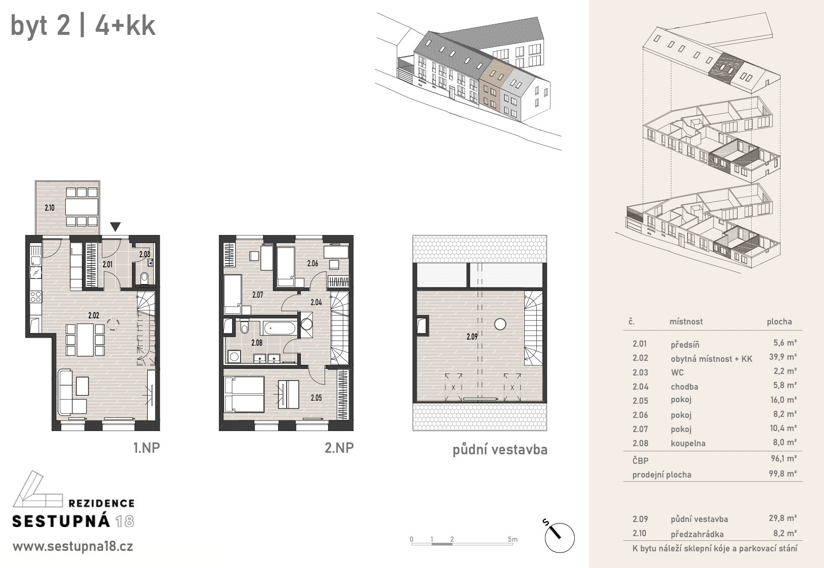 Byt č.2 je v podstatě řadový domek, který má samostatný vstup ze společné zahrady. K tomuto bytu náleží předzahrádka o velikosti 8,2 m2. Vzhledem ke svažitému terénu jsou přízemní okna směrem do ulice příjemně vyvýšena. Byt je rozložen do 3 podlaží, vestavěná půdní galerie není započítána v užitné ploše, nicméně může sloužit jako další pokoj či pracovna a dá se zde dodělat koupelna Proto tento byt ocení zejména klienti, kteří hledají dispozici větší než 4kk.