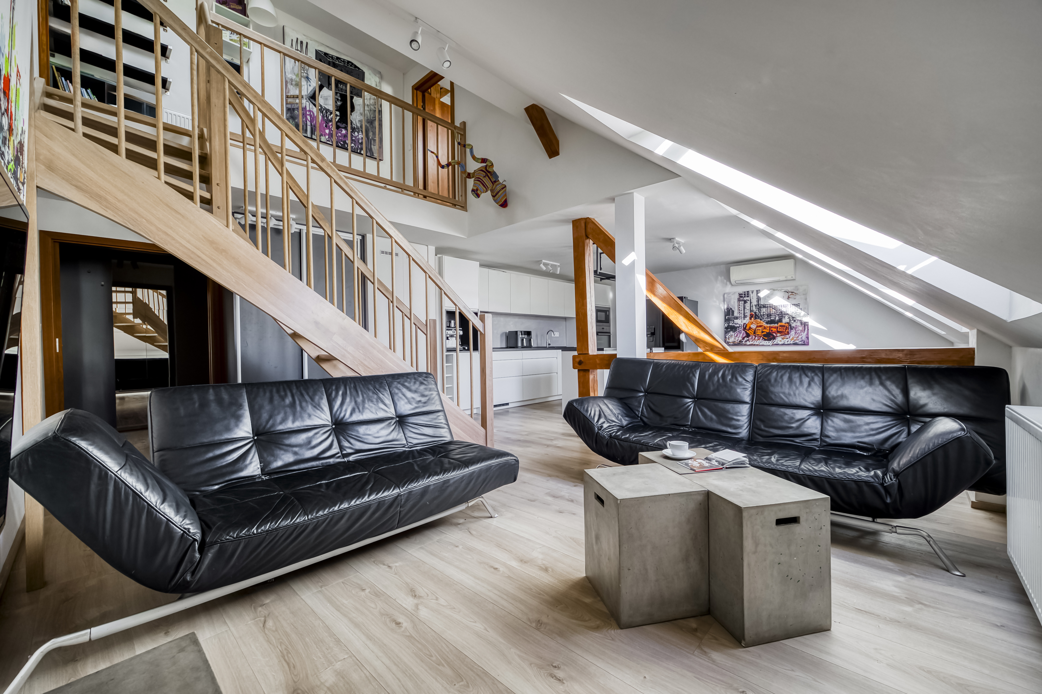 Byt je situován v posledních dvou patrech činžovního domu z období secese a nabízí příjemnou atmosféru podkrovního bydlení s přiznanými trámy. Lokalita patří mezi velmi vyhledávané díky své centrální poloze a blízkosti nábřeží řeky Vltava a oblíbené pražské náplavky, která je známá kavárnami, restauracemi a kulturním životem.