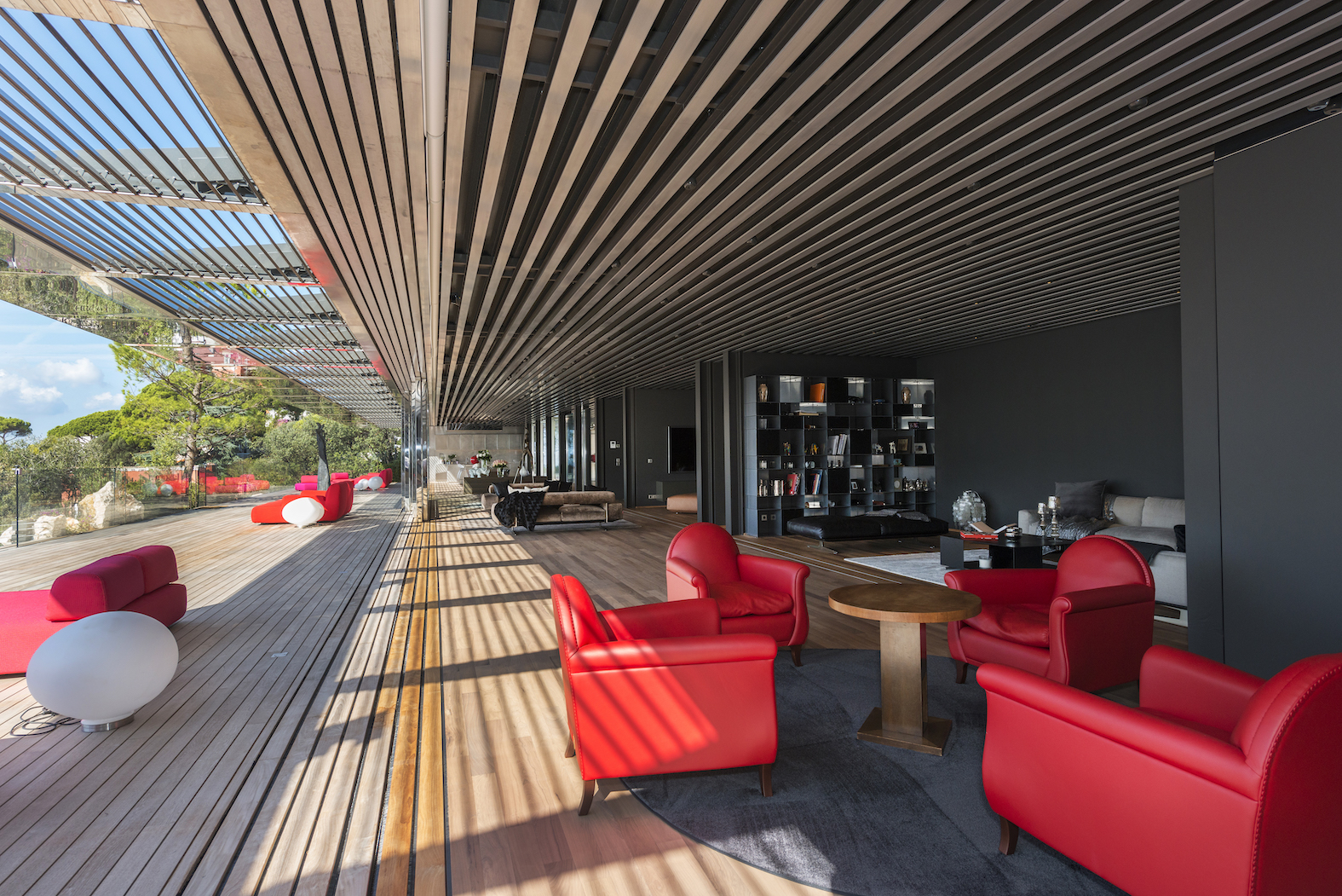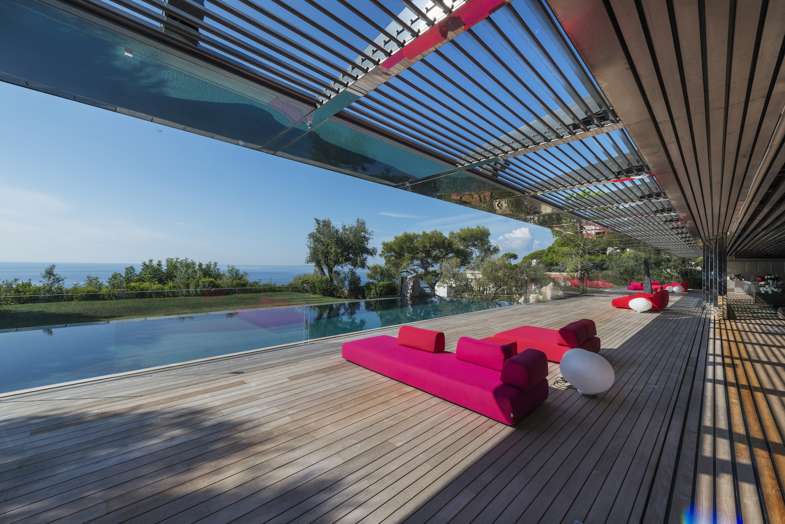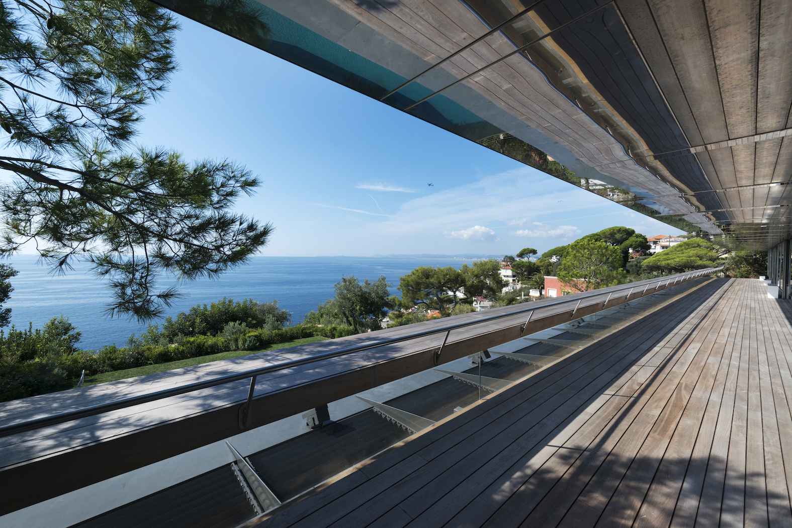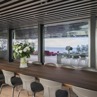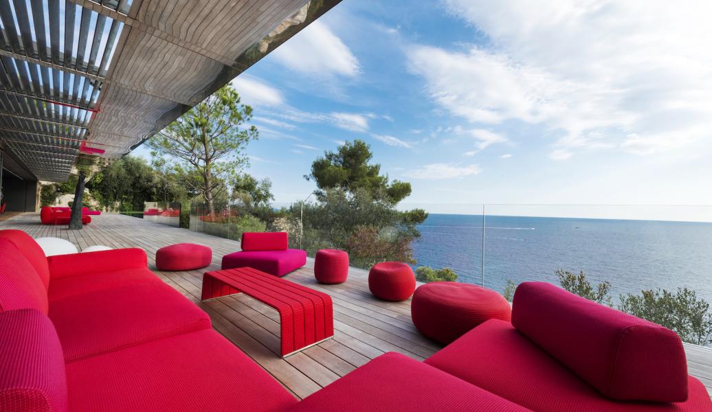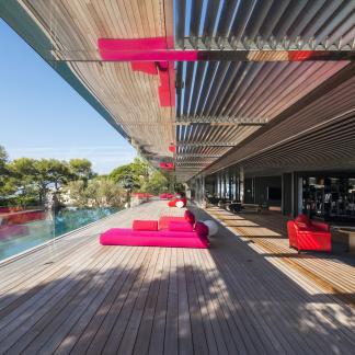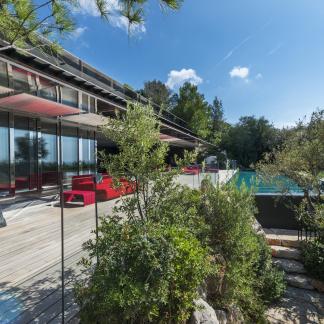 Od vchodu je krása diskrétní. Od moře se konstrukce z nerezové oceli a skla skládá z geometrických a horizontálních linií na výběžku z viditelných kamenů osázených středomořskými rostlinami.