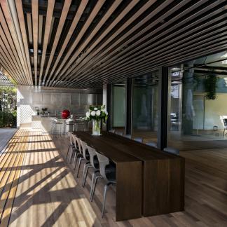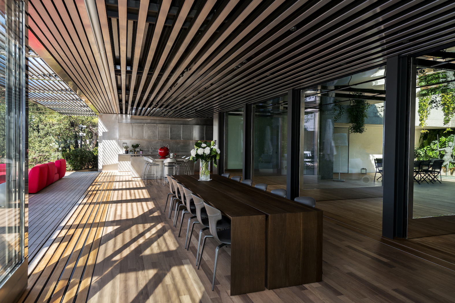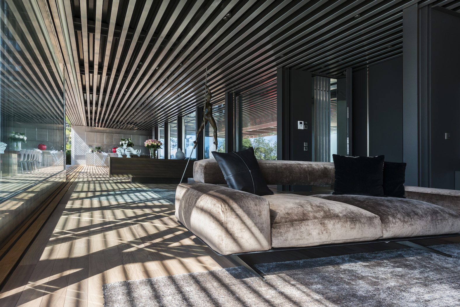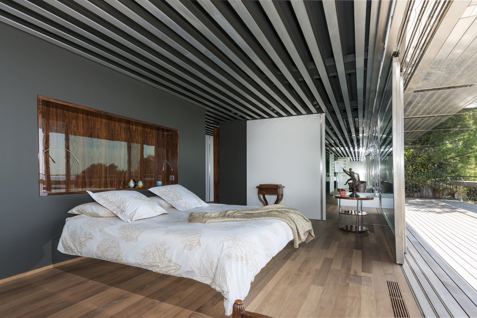 Od vchodu je krása diskrétní. Od moře se konstrukce z nerezové oceli a skla skládá z geometrických a horizontálních linií na výběžku z viditelných kamenů osázených středomořskými rostlinami.