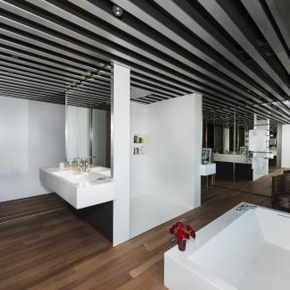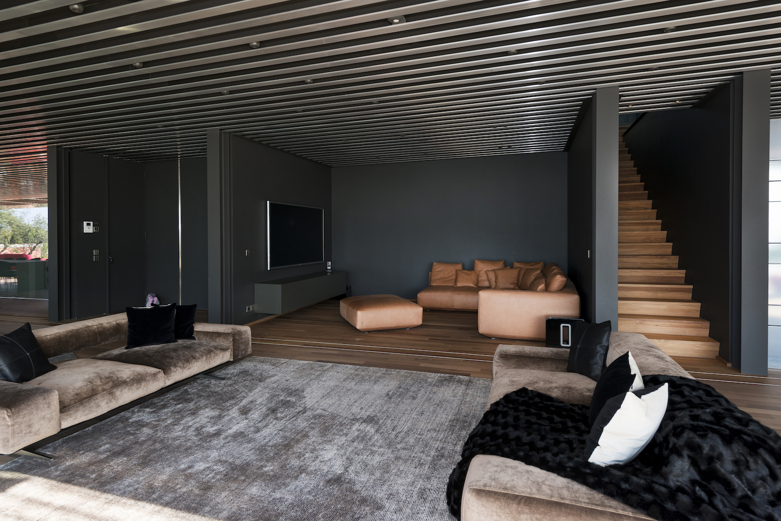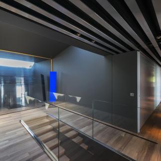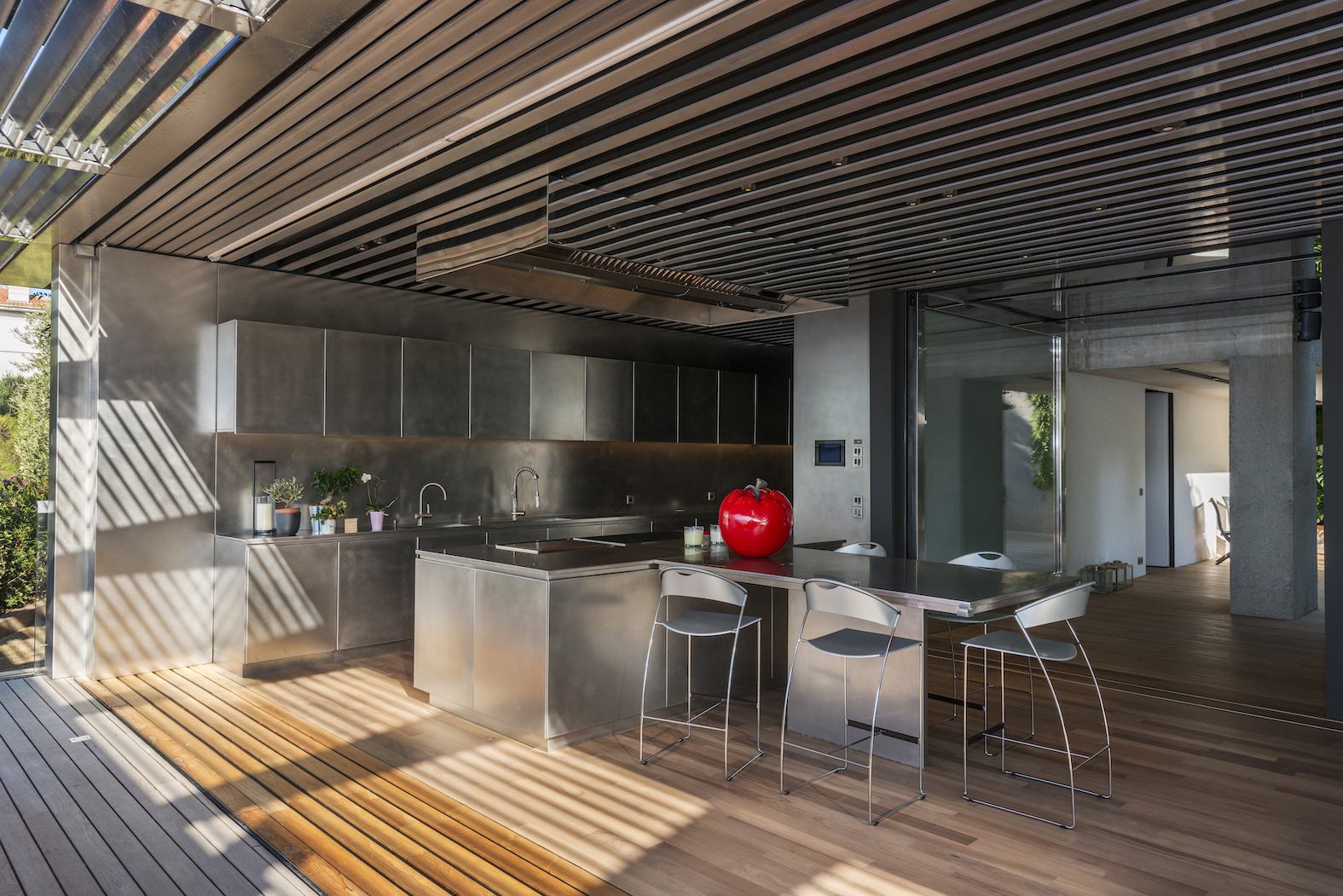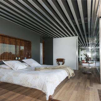 Vstup je přes střechu, která je zcela osázena rostlinami. Lanovka lemovaná schodištěm spojuje dvě obytná patra: čtyři apartmá a obývací pokoj, který je díky svému objemu a výhledu na rozlehlou azurovou hladinu přímo úchvatný.