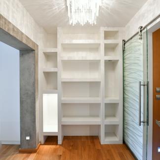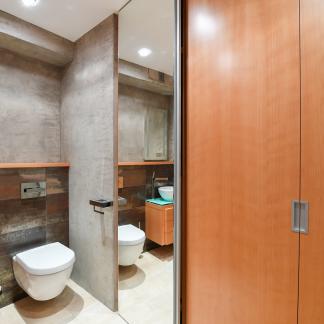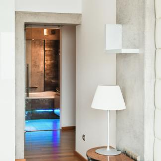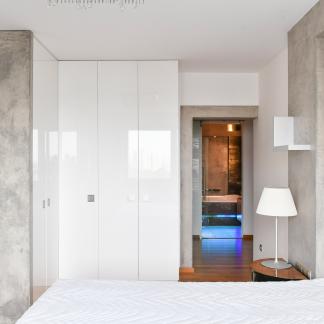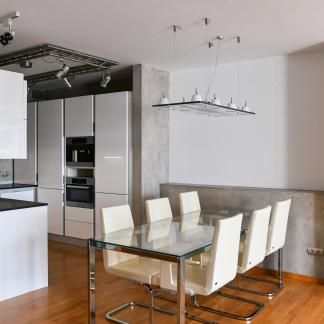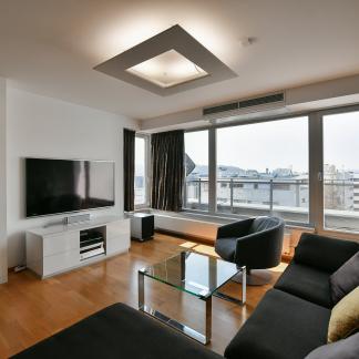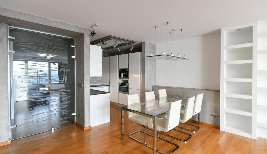 The apartment underwent a complete renovation ten years ago, designed by the renowned architect Šusta, and is being rented including all built-in furniture and designer lighting. The interior meets the highest standards, featuring heated floors in the bathrooms, two custom-built walk-in closets, a premium kitchen with Miele appliances, including a built-in coffee machine and plate warmer, air conditioning in all rooms, concrete finishes, high-end Artemide lighting, and ambient lighting. The apartment is also equipped with built-in speakers for enhanced sound and an alarm system.